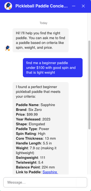 I built a custom Chatbot to answer questions about pickleball paddles for a made up landing page to prep for an upcoming interview. It's pretty amazing that I can point the Chat GPT API to a CSV of pickleball paddle data and the chatbot will make sense of it without much context or instructions.